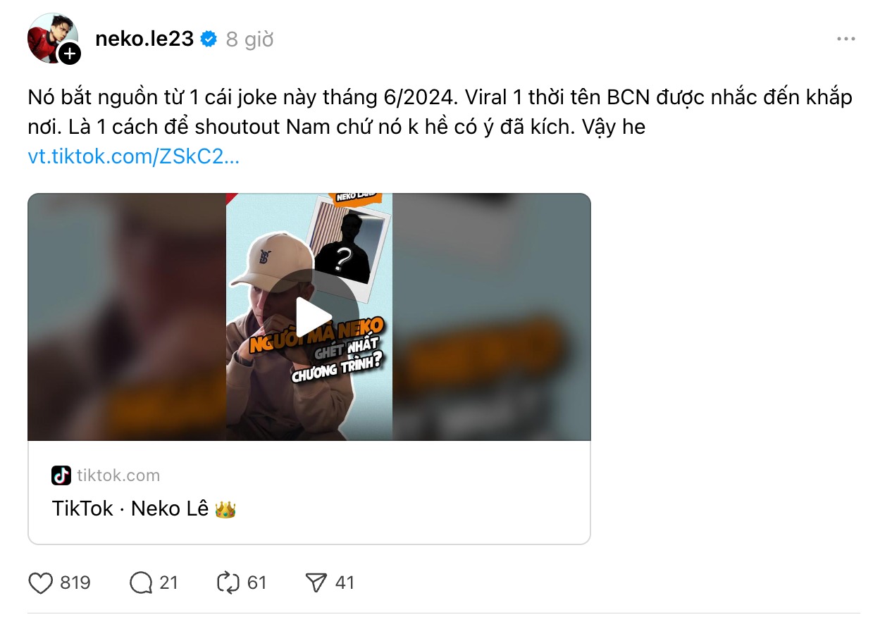 Sau đó Neko Lê cũng phải lên tiếng thanh minh rằng: “Nó bắt nguồn từ 1 cái joke này tháng 6/2024. Viral 1 thời tên BCN được nhắc đến khắp nơi. Là 1 cách để shoutout Nam chứ nó k hề có ý đã kích. Vậy he.”