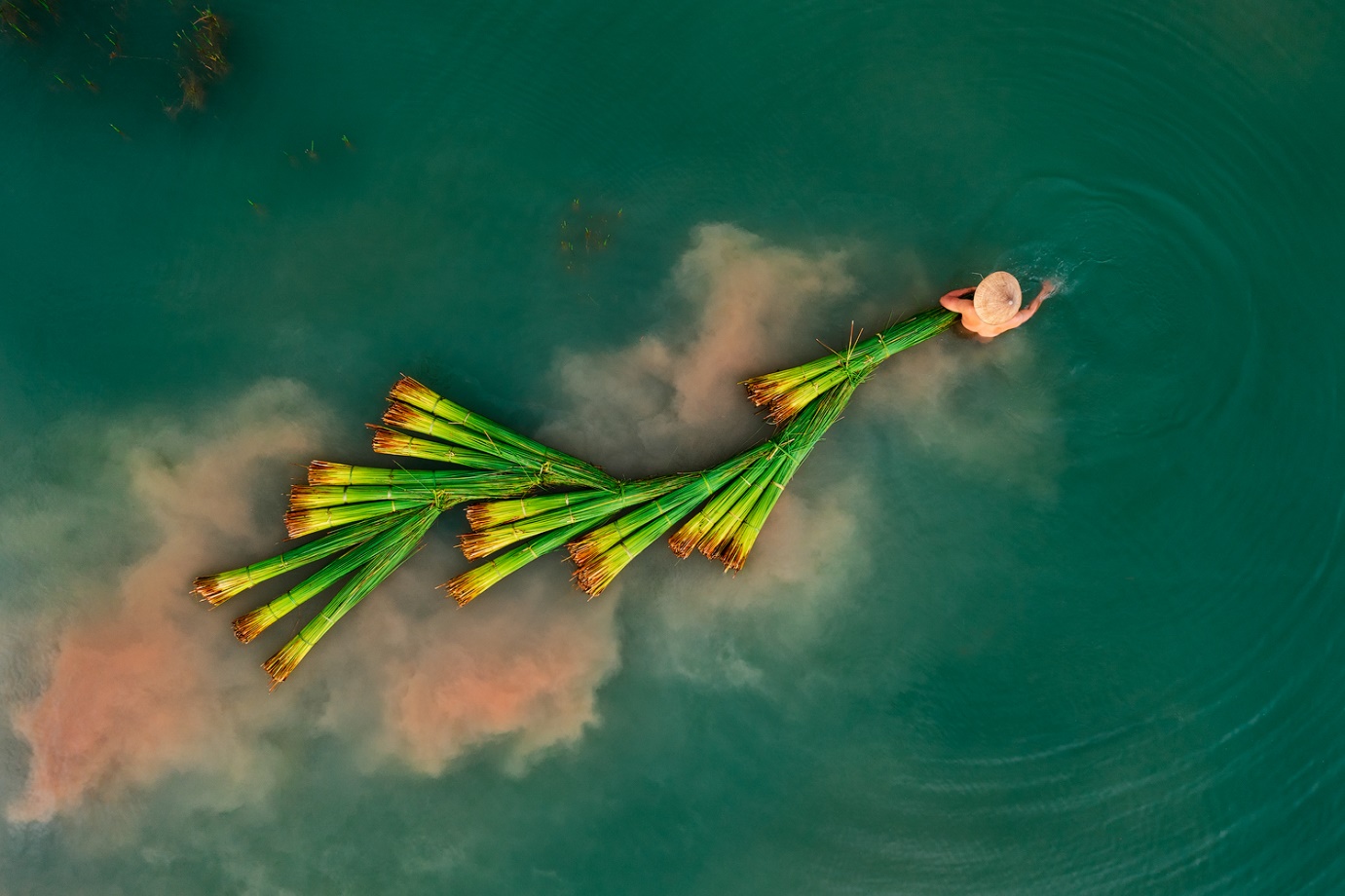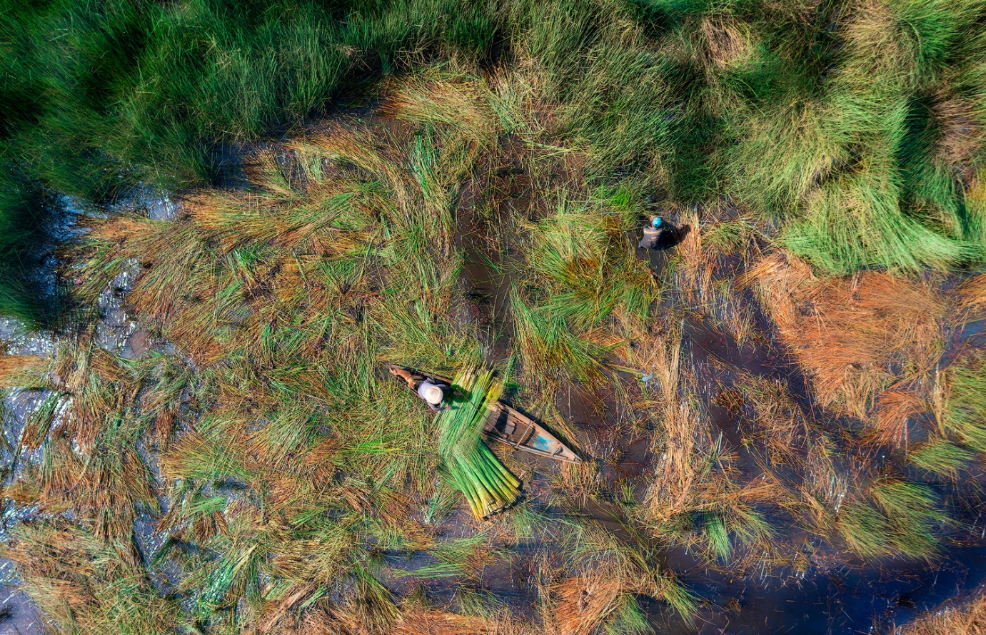 Khoảnh khắc người dân Long An thu hoạch cỏ bàng giành giải nhất mục Chân dung của cuộc thi ảnh trên cao Skypixel.