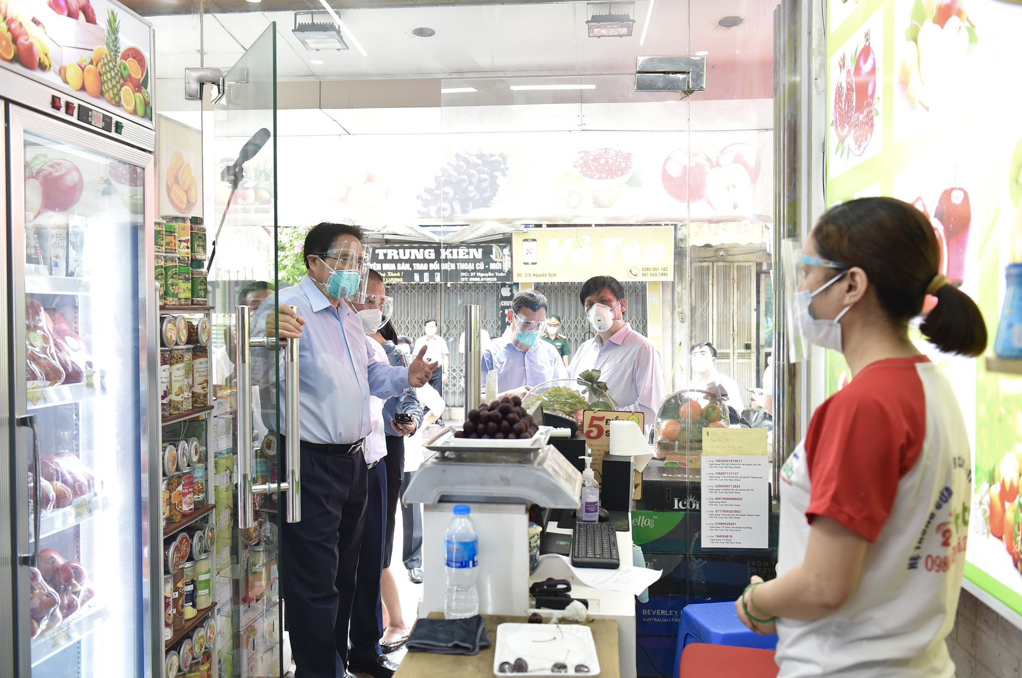 Thủ tướng Phạm Minh Chính kiểm tra và hỏi thăm tình hình phòng chống dịch tại các cơ sở kinh doanh trên đường Nguyễn Tuân, quận Thanh Xuân.