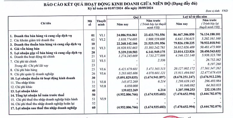 Doanh thu tài chính giảm 30% về còn hơn 1,2 tỷ đồng, nhưng các khoản chi phí trong kỳ của doanh nghiệp đều tăng so với cùng kỳ năm trước. Cụ thể, chi phí bán hàng đạt 6,4 tỷ đồng, chi phí quản lý doanh nghiệp đạt 5,3 tỷ đồng; tăng lần lượt 18% và 32% so với cùng kỳ năm 2023. Kết quả, Halico tiếp tục báo lỗ sau thuế gần 5 tỷ đồng trong quý 3/2024.