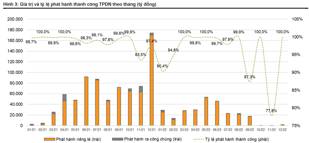Trong quý 4/2022, tổng giá trị trái phiếu doanh nghiệp phát hành chỉ đạt 3.619 tỷ đồng, giảm 94,5% so với quý trước và 98,8% so với cùng kỳ. Trong đó, hầu hết là trái phiếu phát hành riêng lẻ và không có đợt phát hành trái phiếu công chúng nào.