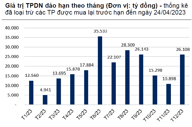 Theo ước tính của VnDirect trong tháng 5/2023 sẽ có khoảng hơn 17,88 nghìn tỷ đồng TPDN riêng lẻ đáo hạn tăng 12,6% so với tháng 4/2023 số liệu đã loại trừ các trái phiếu được mua lại trước hạn đến ngày 24/04/2023.