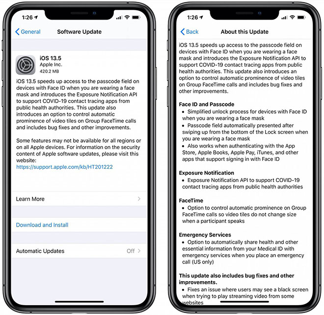 Bản cập nhât iOS 13.5 và iPadOS 13.5 hiện có sẵn cho mọi người dùng iPhone, iPad hoặc iPod touch nhằm mang đến nhiều tính năng mới và thay đổi, bao gồm API thông báo phơi nhiễm mà các nhà phát triển có thể sử dụng để xây dựng các ứng dụng theo dõi tiếp xúc để kiểm soát sự lây lan của virus SARS-CoV-2.