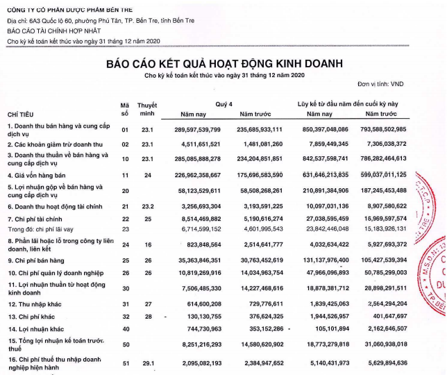 Lũy kế năm 2020, DBT đạt 850.4 tỷ đồng doanh thu. Giá vốn bán hàng đạt 631.6 tỷ đồng nên lợi nhuận gộp đạt 187.2 tỷ đồng. Ngoài ra, lãi sau thuế trong năm đạt 10.4 tỷ đồng, giảm hơn 1 nửa so với năm 2019.