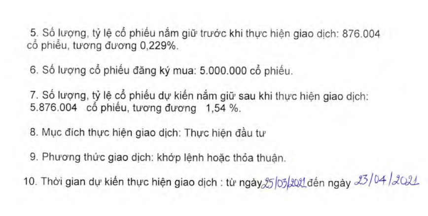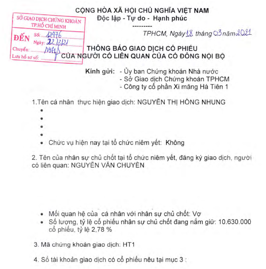 Giao dịch dự kiến thực hiện từ 25/3 đến 23/4 theo phương thức khớp lệnh hoặc thỏa thuận. Theo đó, bà Nhung đăng ký mua 5 triệu cổ phiếu để nâng sở hữu từ 0,23% lên 1,54% vốn điều lệ tại HT1.
