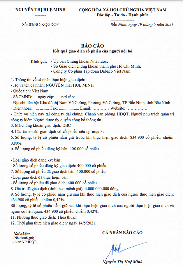 Bà Nguyễn Thị Huệ Minh vừa có văn bản báo cáo kết quả giao dịch cổ phiếu của người nội bộ CTCP Tập đoàn DABACO Việt Nam (MCK: DBX)