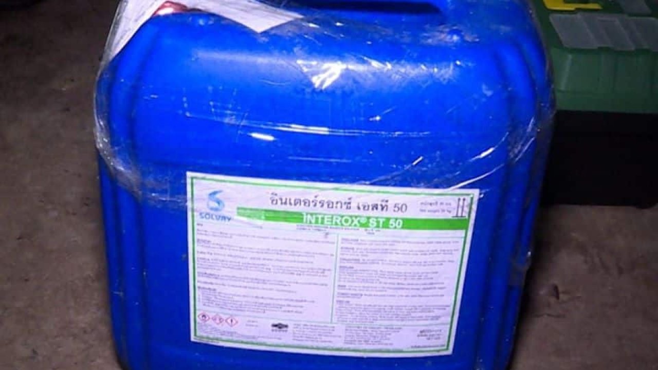 Đáng chú ý, khi kiểm tra khuôn viên công ty, công an phát hiện hai thùng nhựa màu xanh (loại 35kg/thùng), bên ngoài thùng có giấy thông tin bằng chữ Thái Lan và có dòng "Interox ST50" to, đậm trên giấy. Trong hai thùng này, một thùng đã hết nguyên liệu bên trong, thùng còn lại vẫn đầy chất lỏng.