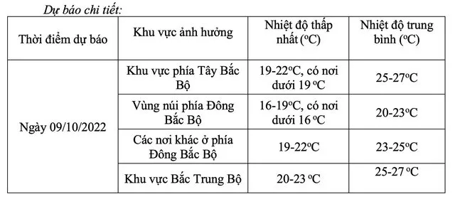 Từ đêm 09/10, ở Bắc Bộ và Bắc Trung Bộ trời lạnh, vùng núi trời rét. Trong đợt không khí lạnh này nhiệt độ thấp nhất về đêm và sáng ở vùng núi Bắc Bộ phổ biến từ 16-18 độ; khu vực trung du, vùng đồng bằng Bắc Bộ và Bắc Trung Bộ từ 19-21 độ.