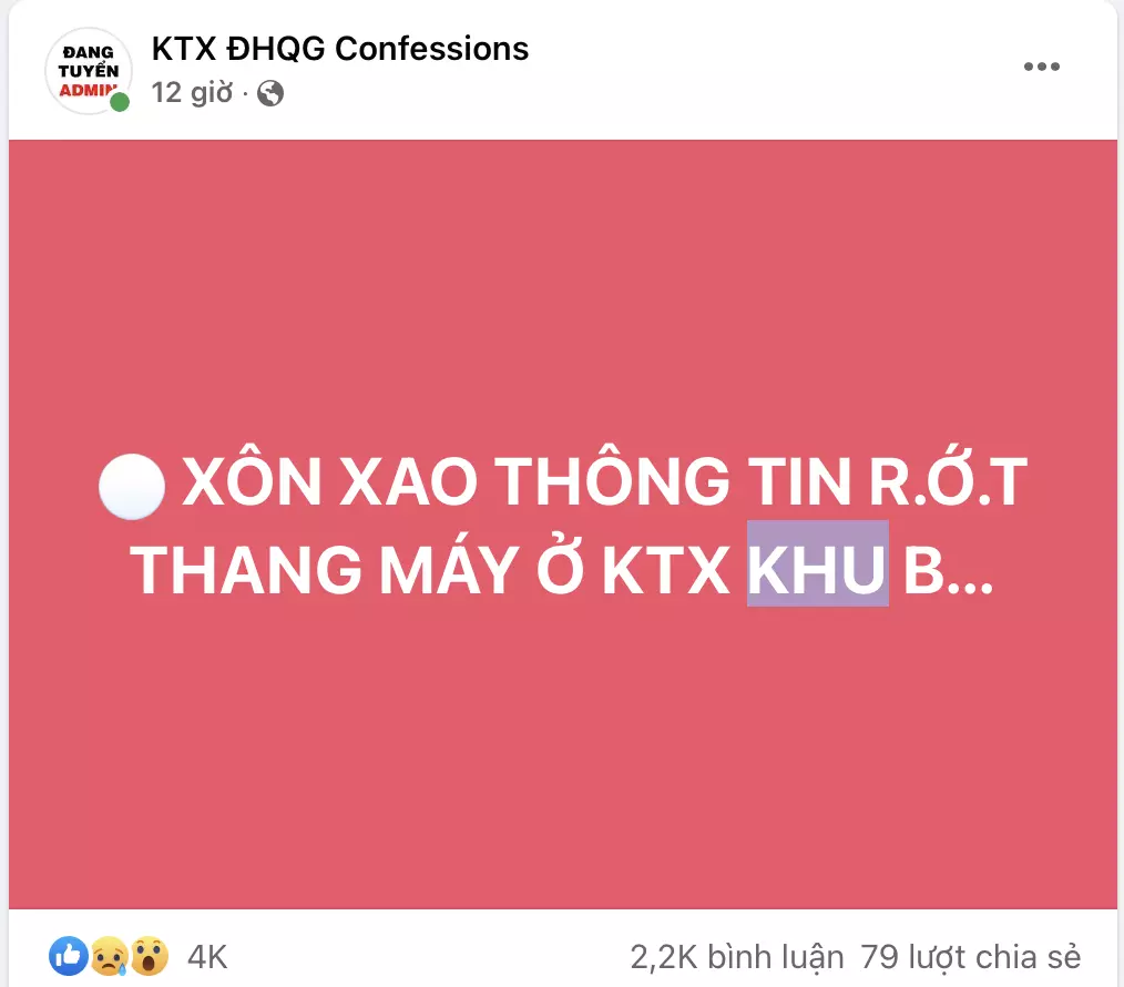 Trước đó, đêm qua 28/4, trên các fanpage sinh viên KTX ĐH Quốc gia TP HCM như KTX ĐHQG Confessions, Hội những người ở ký túc xá khu B - KTX ĐHQG TP HCM đã xuất hiện thông tin: "rớt thang máy ở KTX khu B”.