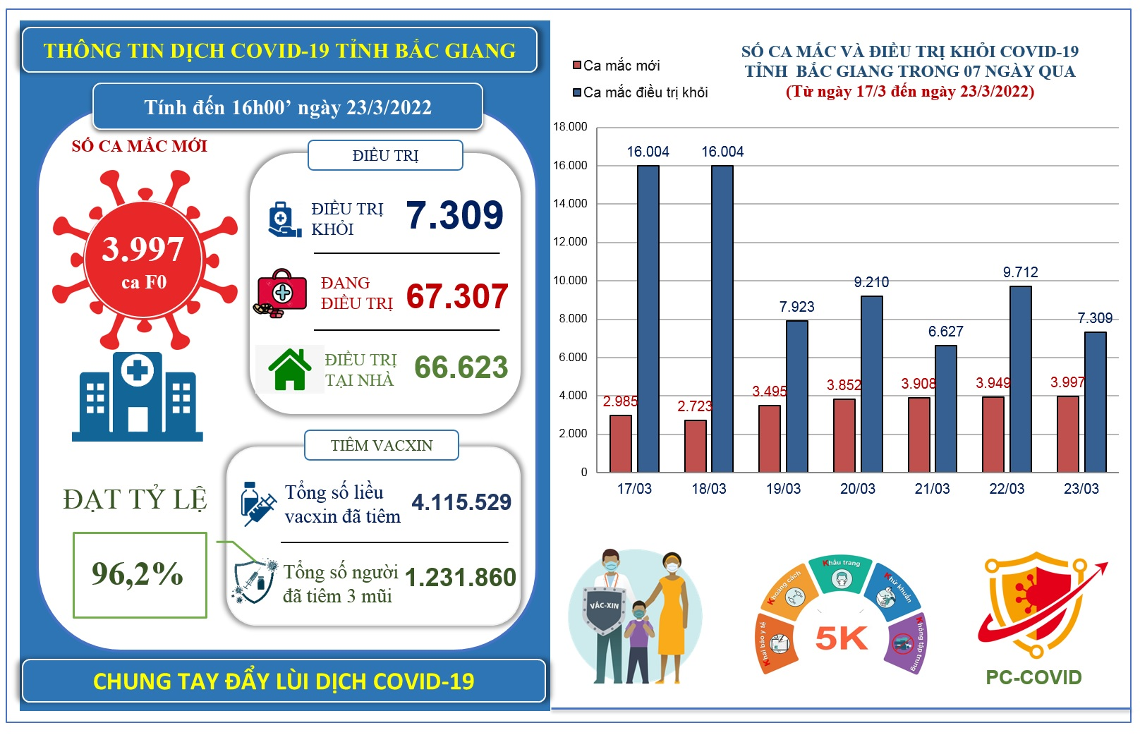 Hiện nay, hình dịch bệnh trên địa bàn tỉnh Bắc Giang đã được kiểm soát tốt, số ca mắc đang giảm dần. Theo Sở Y tế Bắc Giang, tính đến 16h ngày 23/3/2022, trên địa bàn tỉnh Bắc Giang ghi nhận 3.997 ca mắc mới COVID-19 (ca F0).