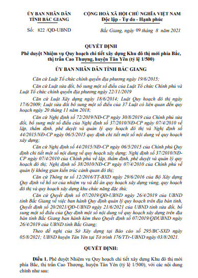 Ngày 9/8, UBND tỉnh Bắc Giang đã ban hành Quyết định số 822/QĐ-UBND về việc Phê duyệt nhiệm vụ Quy hoạch chi tiết xây dựng Khu đô thị mới phía Bắc, thị trấn Cao Thượng, huyện Tân Yên (tỷ lệ 1/500).