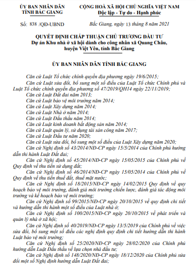 Triển khai chủ trướng này, mới đây, Phó Chủ tịch UBND tỉnh Bắc Giang đã ký quyết định số 838/QĐ-UBND ban hành ngày 13/8 về việc chấp thuận chủ trương đầu tư dự án khu nhà ở xã hội dành cho công nhân xã Quang Châu, huyện Việt Yên.
