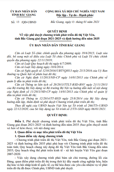 Chương trình phát triển đô thị Việt Yên, tỉnh Bắc Giang giai đoạn 2021 - 2025 và định hướng đến năm 2035.