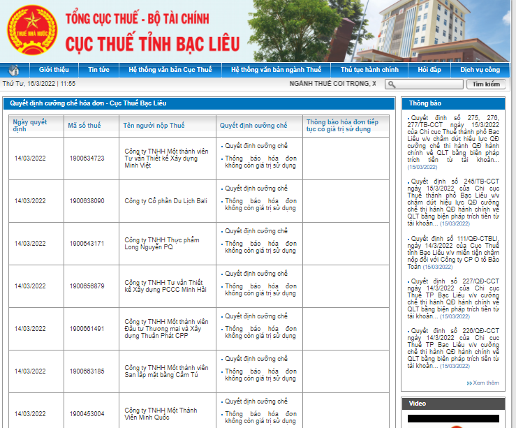 Cụ thể, ngày 14/3, Cục thuế Bạc Liêu đã ban hành các quyết định cưỡng chế và Thông báo về việc ngừng sử dụng hoá đơn đối với 17 doanh nghiệp trên địa bàn.