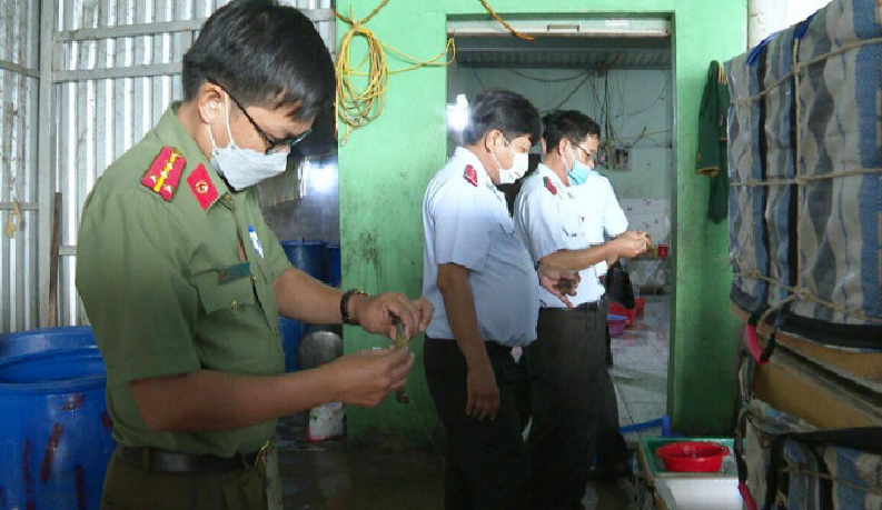 Trước đó, vào 12h20 ngày 2/6, lực lượng liên ngành gồm Thanh tra Sở Nông nghiệp và Phát triển nông thôn, Công an xã Tân Phong bắt quả tang cơ sở của ông Lâm Thanh Dúp tổ chức bơm, chích tạp chất vào tôm nguyên liệu.