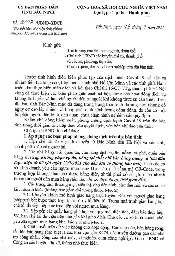 Văn bản của UBND tỉnh Bắc Ninh về việc triển khai các biện pháp phòng, chống dịch COVID-19 trong tình hình mới.
