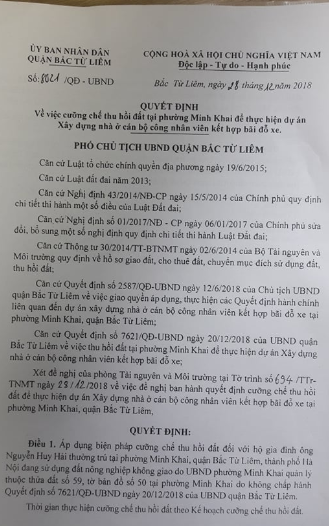 UBND quận Bắc Từ Liêm ra quyết định cưỡng chế thu hồi đất tại phường Minh Khai để triển khai dự án đã được phê duyệt |