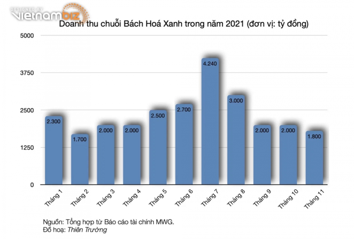 Tuy nhiên, khi bước sang tháng 8, doanh thu Bách Hoá Xanh giảm còn hơn 3.000 tỷ đồng. Con số tiếp tục giảm xuống gần 2.000 tỷ đồng vào cuối tháng 9 và sang tháng 11 chỉ còn 1.800 tỷ đồng.