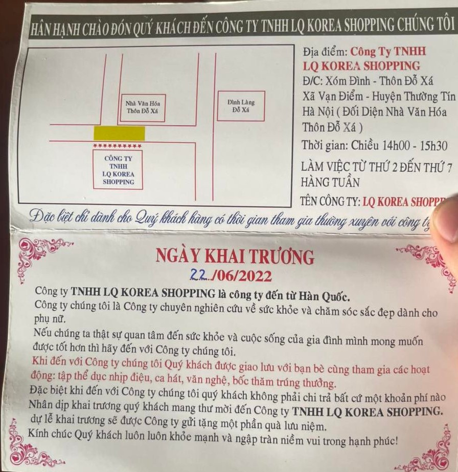 Theo thông tin được người dân cho biết, địa điểm đang được tổ chức hội thảo “kỳ lạ” này được Công ty TNHH LQ KOREA SHOPPING thuê lại của một nhà dân. Doanh nghiệp này thuê nhà để làm hội trường nhằm tổ chức chương trình chào bán những sản phẩm được giới thiệu là hắc sâm, kẹo sâm,… được nhập khẩu từ Hàn Quốc. Phía trước căn nhà, khu vực sân đình làng là hàng trăm chiếc xe đạp, xe điện xếp thành từng hàng, với những chiếc nón lá được treo trên xe.