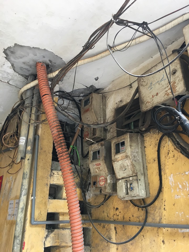 Đặc biệt khu cầu thang lên xuống đã bị nứt gãy và được vá chằng chịt, dây điện, dây mạng chằng chịt khắp các hành lang. Ông Minh (70 tuổi) cư dân tại đây chia sẻ: “Lên cầu thang, chúng tôi không dám bước mạnh, xe máy lên xuống không được nổ máy vì trần nhà nứt lở đến trơ gạch như sắp rơi xuống đầu, trẻ con vui chơi phải có người lớn trông chừng”.