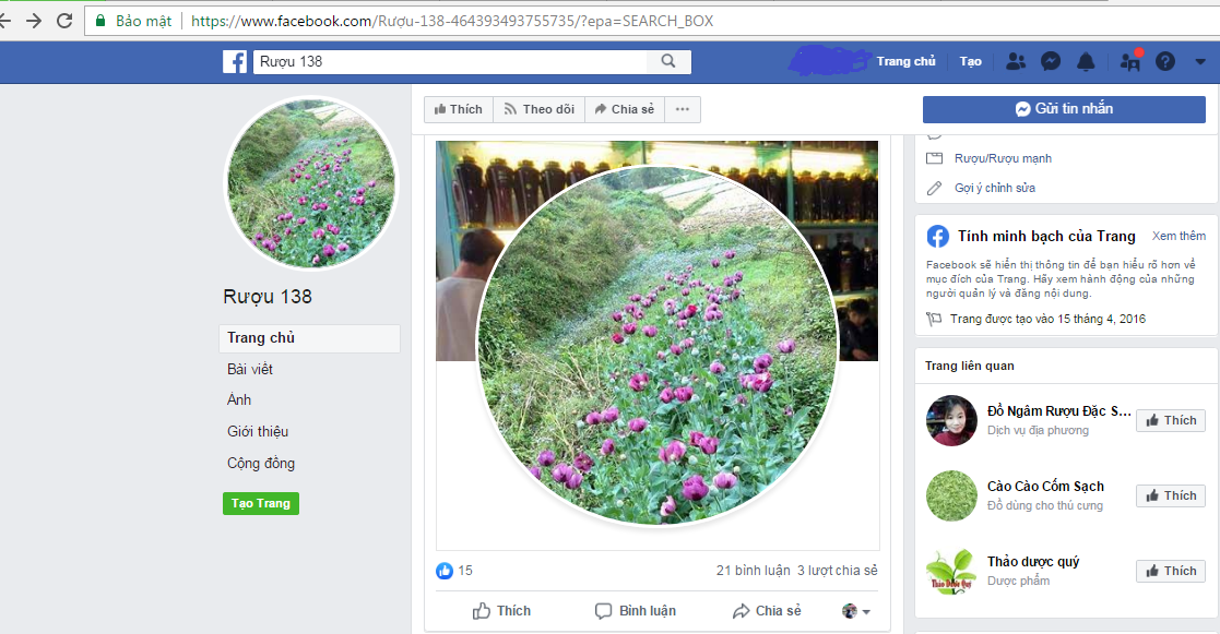 Tài khoản Facebook có tên "Rượu 138" đăng tải hình ảnh khá bắt mắt là những bình rượu dung tích 5 lít, kèm theo là hình ảnh cây thuốc phiện trồng đang dịp nở hoa. Những bông hoa cây Anh túc tím ngắt sắp cho quả để rồi được ngâm vào những bình rượu được cho là thần dược nam giới. Nhìn vào chắc ai cũng tin chắc chắn đây là rượu ngâm anh túc thật rồi.