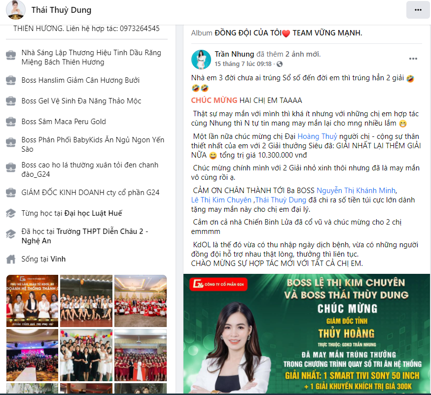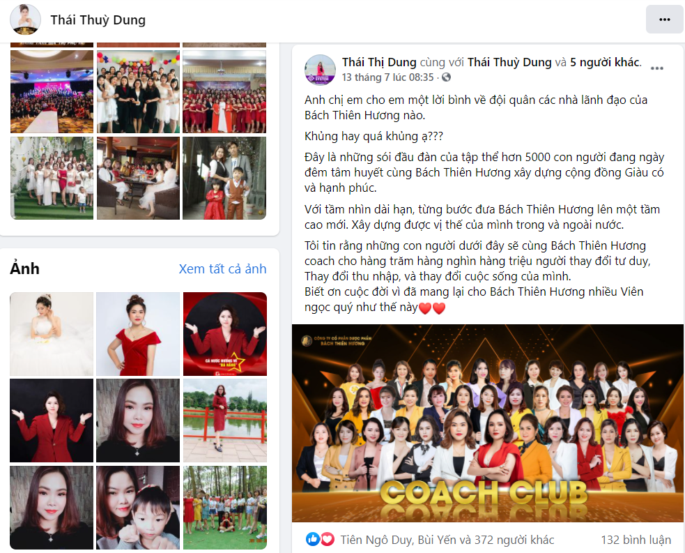 Theo tìm hiểu, Boss Thái Thùy Dung, Boss Lê Thị Kim Chuyên, Người dẫn đường Nguyễn Thị Thủy, Giám đốc kinh doanh Hồ Thị Lợi, Nguyễn Thị Như Tuyết… là những thủ lĩnh hàng đầu trong hệ thống phân phối bán hàng, đào tạo cộng tác viên, tuyển đại lý của Công ty CP Dược phẩm Bách Thiên Hương. Thường xuyên có những bài viết đăng trên trang cá nhân để tăng lượng tương tác tác như: các dự án khởi nghiệp 0 đồng, doanh số hàng trăm đến hàng tỷ đồng mỗi tháng đối với mỗi hệ thống, thủ lĩnh đứng đầu tập thể hơn 5.000 người, hay hình ảnh hàng nghìn sản phẩm đến nỗi khan hàng để giao cho các đại lý; phần thưởng bốc thăm là xe máy, tiền mặt cho các đại lý…
