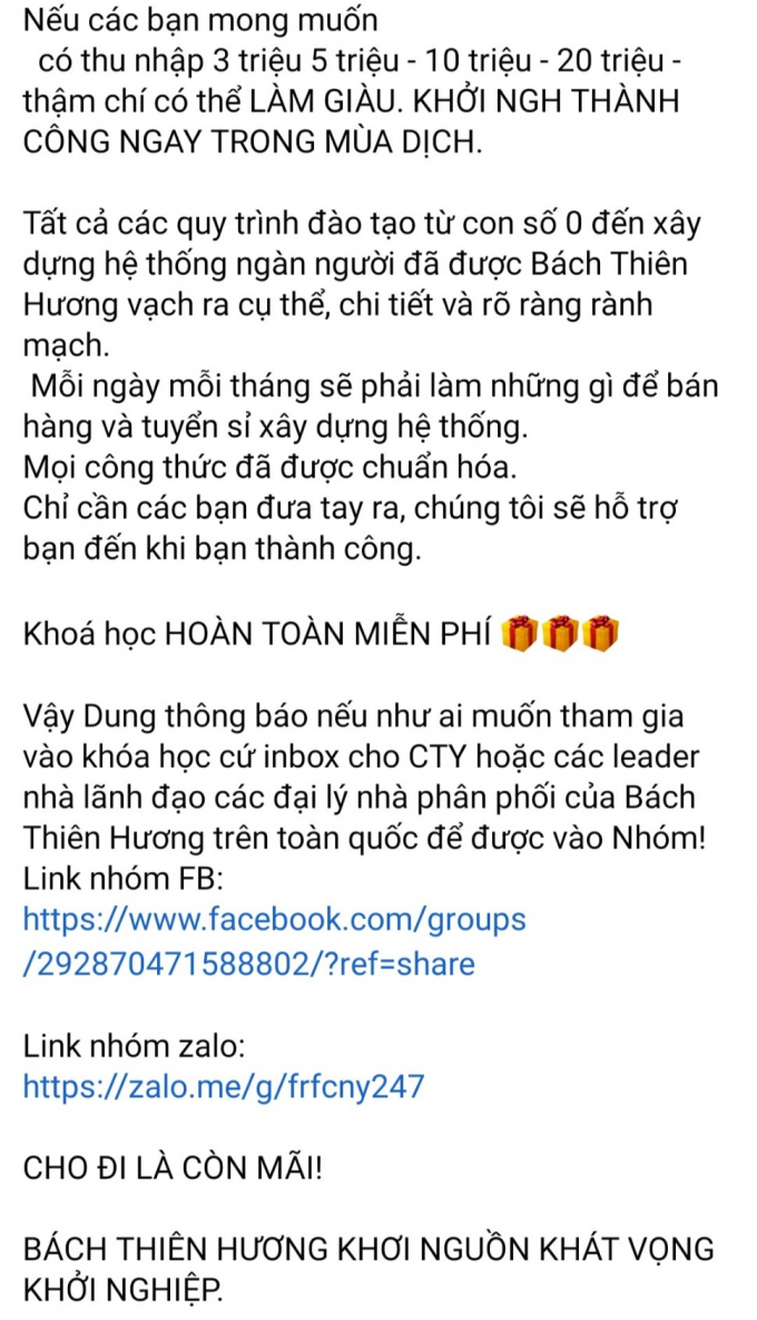 Vậy lý do nào mà không thể tương tác được với số điện thoại của người đứng đầu công ty Bách Thiên Hương để liên hệ làm việc? Thực chất của hệ thống kinh doanh phân phối hơn 5.000 người được Boss Thái Thùy Dung quảng cáo là gì?.