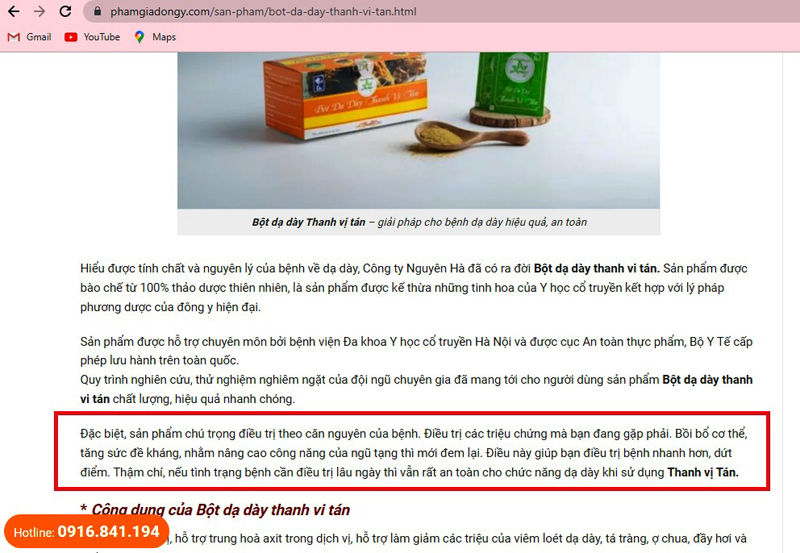 Sản phẩm Bột dạ dày Thanh vị tán được giới thiệu để "Điều trị các triệu chứng mà bạn đang gặp phải"