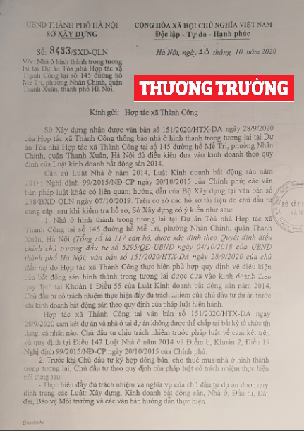 Văn bản số 9483/SXD-QLN về việc nhà ở hình thành trong tương lai tại dự án Tòa nhà Hợp tác xã Thành Công của Sở Xây dựng Hà Nội.