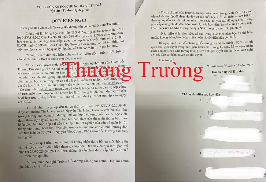 Đơn kiến nghị mà học viên đã gửi về nhà trường mong được giải đáp những vướng mắc về sự việc (ảnh: ĐP)