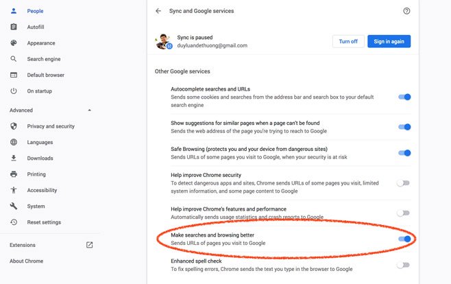 Để kích hoạt chức năng bảo vệ khỏi lừa đảo theo thời gian thực, bạn truy cập vào Settings -> chọn People -> Chọn Sync and Google Services -> bật dòng Make searches and browsing better.