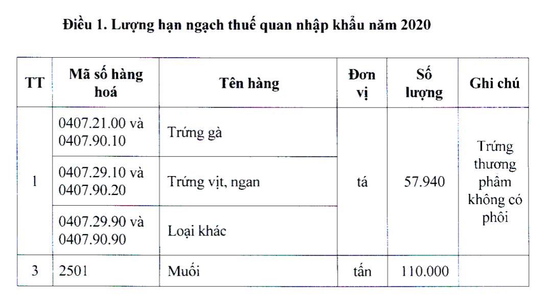 Cụ thể, theo thông tư 02/2020/TT-BCT, lượng hạn ngạch thuế quan nhập khẩu năm 2020 như sau: Tổng số sản phẩm trứng gà có mã 0407.21.00 và 0407.90.10; trứng vịt, ngan có mã 0407.29.10 và 0407.90.20; các loại khác có mã 0407.29.90 và 0407.90.90 là 57.194 tá. Bên cạnh đó, sản phẩm muối mã 2501 có hạn ngạch là 110.000 tấn.