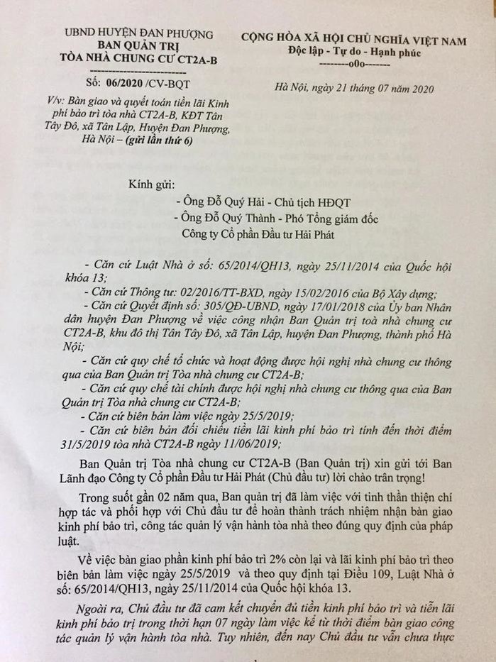 Ông Hồ Sỹ Thắng, đại diện cho Ban Quản trị chung cư CT2A-B, Tân Tây đô (xã Tân Lập, huyện Đan Phượng) vừa có văn bản số 06/2020/CV-BQT yêu cầu Chủ đầu tư - Công ty Cổ phần đầu tư Hải Phát