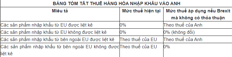 Chính phủ Anh đã công bố mức thuế hải quan (thuế quan) sẽ áp dụng đối với hàng hóa nhập khẩu vào Anh nếu Anh rời EU mà không có thỏa thuận nào. Các mức thuế quan này sẽ có hiệu lực trong vòng 12 tháng. Chính phủ nước này sẽ thảo luận thêm về mức thuế quan cố định tương lai trong giai đoạn này. Chế độ mới sẽ chỉ ảnh hưởng tới hàng hóa nhập khẩu vào Anh.