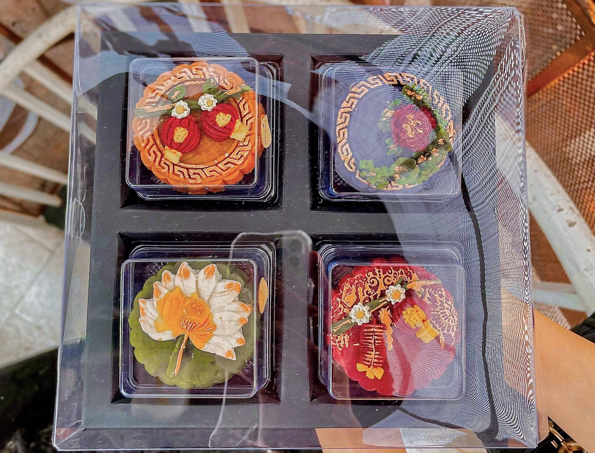 Hộp sản phẩm 4 chiếc bánh trung thu 3D đã được trang trí khá độc đáo, thu hút người tiêu dùng.