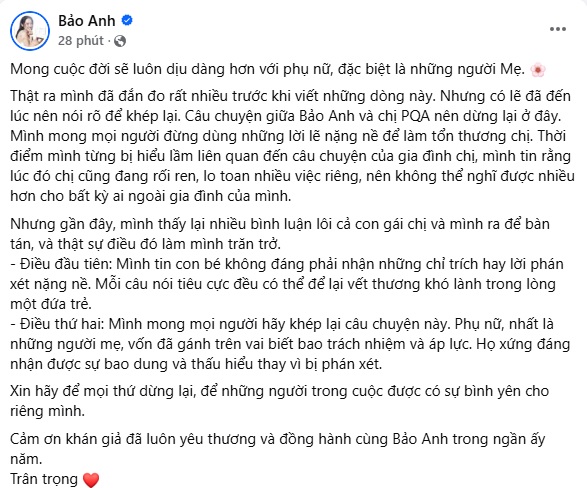Thật ra mình đã đắn đo rất nhiều trước khi viết những dòng này. Nhưng có lẽ đã đến lúc nên nói rõ để khép lại. Câu chuyện giữa Bảo Anh và chị Phạm Quỳnh Anh nên dừng lại ở đây. Mình mong mọi người đừng dùng những lời lẽ nặng nề để làm tổn thương chị. Thời điểm mình từng bị hiểu lầm liên quan đến câu chuyện của gia đình chị, mình tin rằng lúc đó chị cũng đang rối ren, lo toan nhiều việc riêng, nên không thể nghĩ được nhiều hơn cho bất kỳ ai ngoài gia đình của mình.