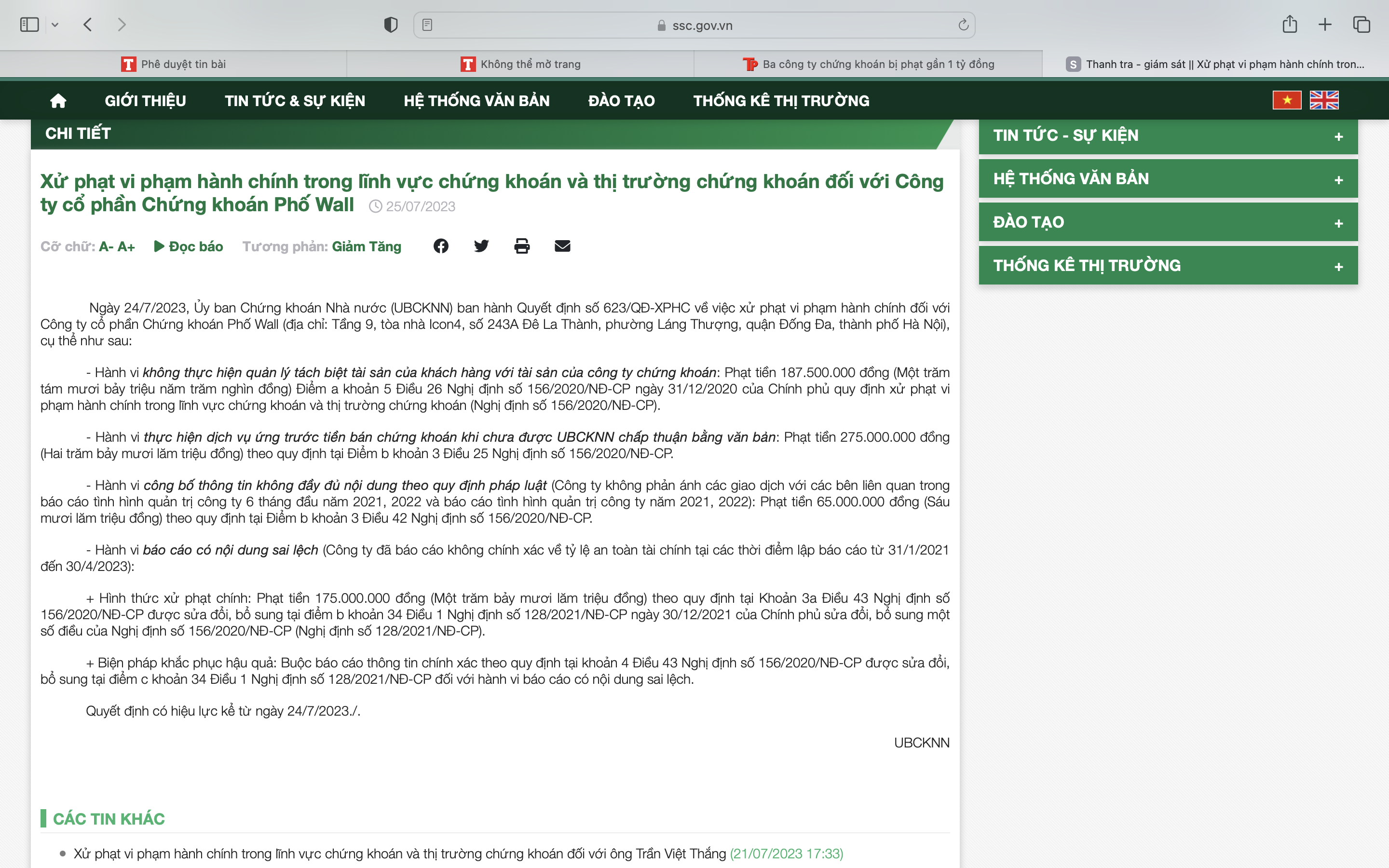 Ngày 24/7/2023, Ủy ban Chứng khoán Nhà nước (UBCKNN) ban hành Quyết định số 623/QĐ-XPHC về việc xử phạt vi phạm hành chính đối với Công ty cổ phần Chứng khoán Phố Wall (địa chỉ: Tầng 9, tòa nhà Icon4, số 243A Đê La Thành, phường Láng Thượng, quận Đống Đa, thành phố Hà Nội), cụ thể như sau: