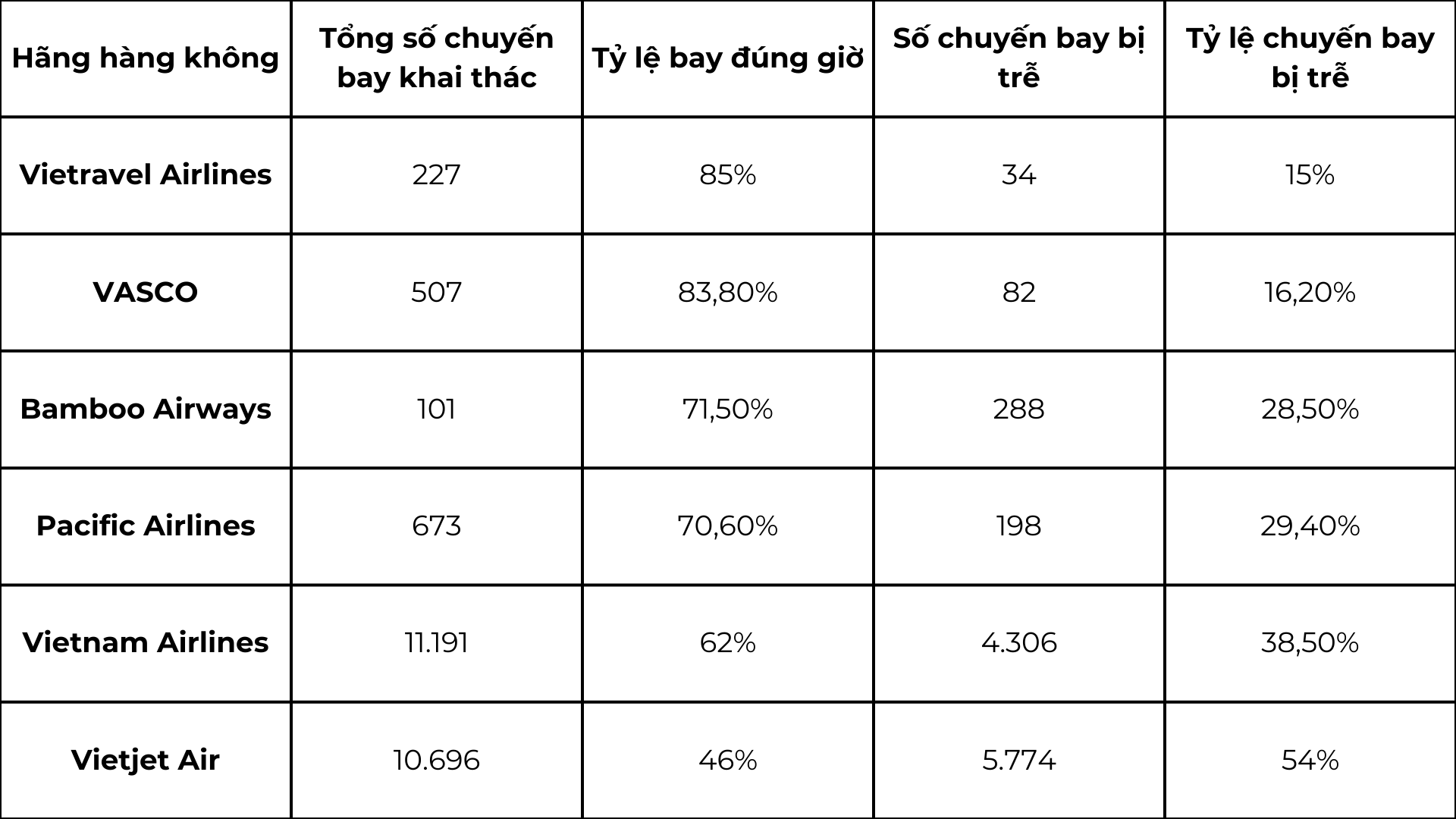 Vietnam Airlines Group (gồm Vietnam Airlines, Vasco, Pacific Airlines) khai thác tổng cộng 11.191 chuyến bay. Riêng Vietnam Airlines có tỉ lệ đúng giờ là 62%, nhưng vẫn có tới 4.306 chuyến bay (38,5%) bị chậm.