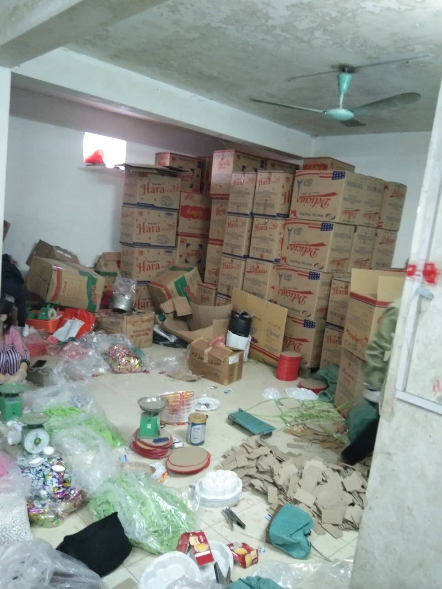 Bánh kẹo, mứt tết được sản xuất gia công trực tiếp dưới nền đất tại La PhùChỉ trong chiều cùng ngày đội QLTT số 24 cũng tiến hành kiểm tra cơ sở sản xuất mứt Tết Khang Mai tại số 19 xóm Hưng Vượng, La Phù, Hoài Đức, Hà Nội. Qua kiểm tra cơ sở này, lực lượng tiếp tục phát hiện hàng loạt sai phạm. Cụ thể, cơ sở không có giấy chứng nhận đăng kí kinh doanh, không đủ điều kiện vệ sinh an toàn thực phẩm, hàng hóa sản xuất, đóng gói không rõ nguồn gốc. Toàn bộ công nhân của cơ sở không được tập huấn về an toàn vệ sinh thực phẩm. Mứt Tết đóng hộp được thực hiện trực tiếp dưới nền nhà. Qua đó, Đội QLTT số 24 đã tiến hành lấy 01 mẫu kiểm nghiệm và tạm giữ 90 kg táo khô, 1020 hộp mứt tết các loại khối lượng 300g.