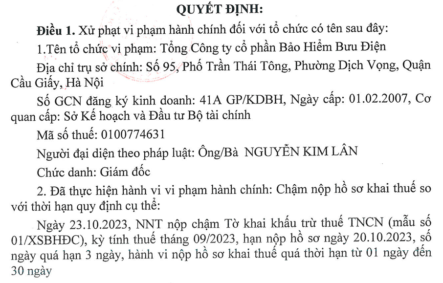Bảo hiểm Bưu điện PTI bị cảnh cáo vì chậm nộp hồ sơ khai thuế