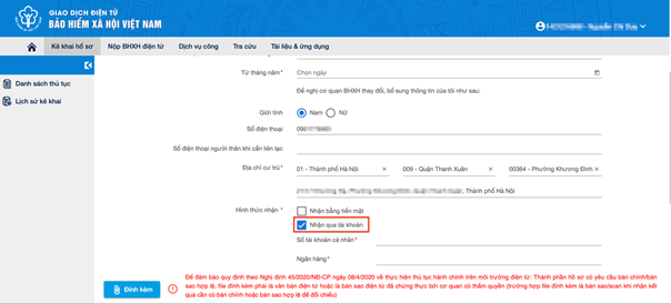 Bước 4: Kê khai vào các trường thông tin có sẵn, sau đó lựa chọn nhận qua tài khoản và điền thông tin về số tài khoản nhận chế độ, mã xác nhận rồi chọn “xác nhận”.