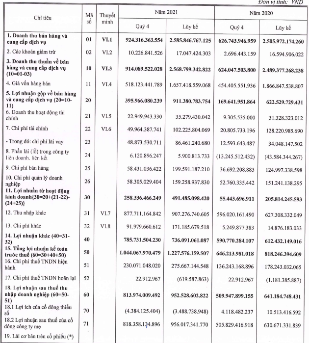 Trong kỳ, doanh thu tài chính cũng tăng gấp 2,5 lần quý 4/2020 đạt 23 tỷ đồng. Chi phí tài chính tăng gấp 2,4 lần lên mức 50 tỷ đồng, chủ yếu là chi phí lãi vay. Ngoài ra chi phí bán hàng và chi phí quản lý doanh nghiệp tăng lần lượt 59% và 11%.