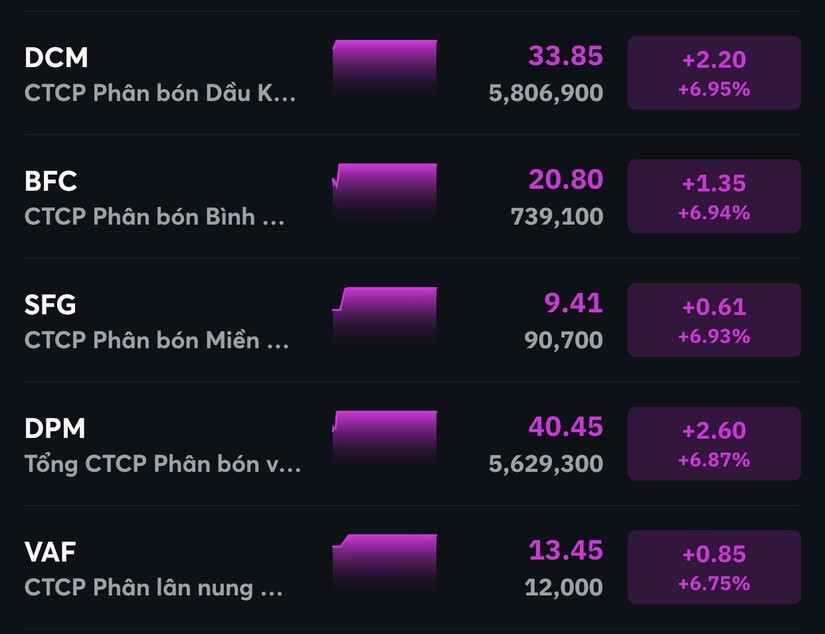 Nhóm cổ phiếu “hút” dòng tiền nhất là phân bón. DGC tăng 3,8%, hàng loạt mã tăng trần như DCM, DPM, LAS, BFC, VAF, SFG, PMB...