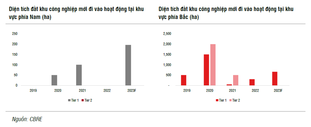Hải Phòng và Bắc Ninh sẽ tiếp tục dẫn đầu về nguồn cung đất công nghiệp cho thuê tại miền Bắc, theo đó Khu công nghiệp Tiến Thành (Hải Phòng) và Gia Bình 2 (Bắc Ninh) với diện tích lần lượt là 410 ha và 250 ha sẽ đi vào hoạt động vào năm 2023 với giá cho thuê trung bình tại các khu công nghiệp khu vực phía Bắc có thể sẽ tăng 1-2% trong năm.