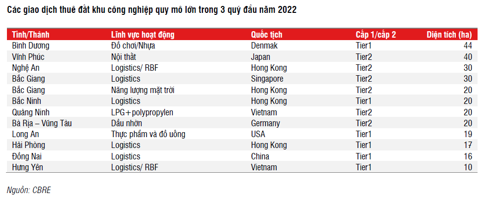 Nhu cầu thuê đất tại các khu công nghiệp tăng mạnh trong năm 2022, do đó một phần hợp đồng MOU sẽ được hoàn thành trong nửa đầu năm 2023. Cụ thể, trong số các KCN đã niêm yết, SSI dự báo IDC có thể ghi nhận khoảng 60-80 ha đất cho thuê (tăng 100% so với cùng kỳ) trong 6 tháng đầu năm 2023 từ các KCN Phú Mỹ II mở rộng và KCN Hựu Thạnh. Trong khi đó, BCM ghi nhận 60 ha đất cho thuê tại Khu công nghiệp Bàu Bàng và Khu công nghiệp Cây Trường, SZC ghi nhận 21ha đất cho thuê, chủ yếu từ hợp đồng với Tổng công ty Sonadezi (SNZ).