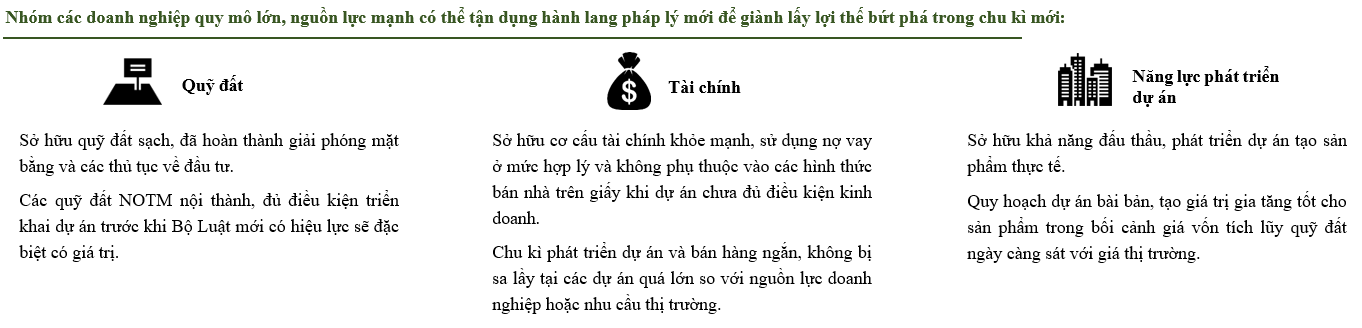 Cụ thể, lợi thế sẽ đến với doanh nghiệp sở hữu quỹ đất sạch, đã hoàn thành giải phóng mặt bằng và các thủ tục về đầu tư. Các quỹ đất NOTM nội thành, đủ điều kiện triển khai dự án trước khi Bộ Luật mới có hiệu lực sẽ đặc biệt có giá trị.