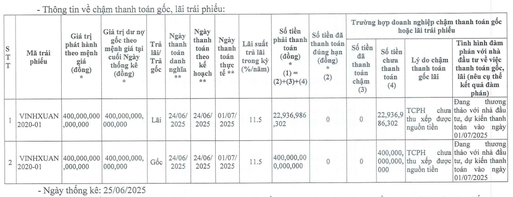 Theo báo cáo gửi Sở Giao dịch Chứng khoán Hà Nội, Bất động sản Vĩnh Xuân phát hành lô trái phiếu VINHXUAN2020-01 trị giá 400 tỷ đồng. Đến kỳ thanh toán ngày 24/6/2025, công ty phải thanh toán gốc và trả lãi số tiền hơn 422,923 tỷ đồng. Tuy nhiên, công ty cho biết chậm thanh toán do "chưa thu xếp được nguồn tiền", tuy nhiên doanh nghiệp đang thương thảo với nhà đầu tư, dự kiến thanh toán bào ngày 01/07/2025.