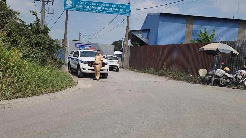 Công an khám xét trung tâm đăng kiểm 50-13D ở huyện Bình Chánh hồi tháng 2. Ảnh: plo.vn