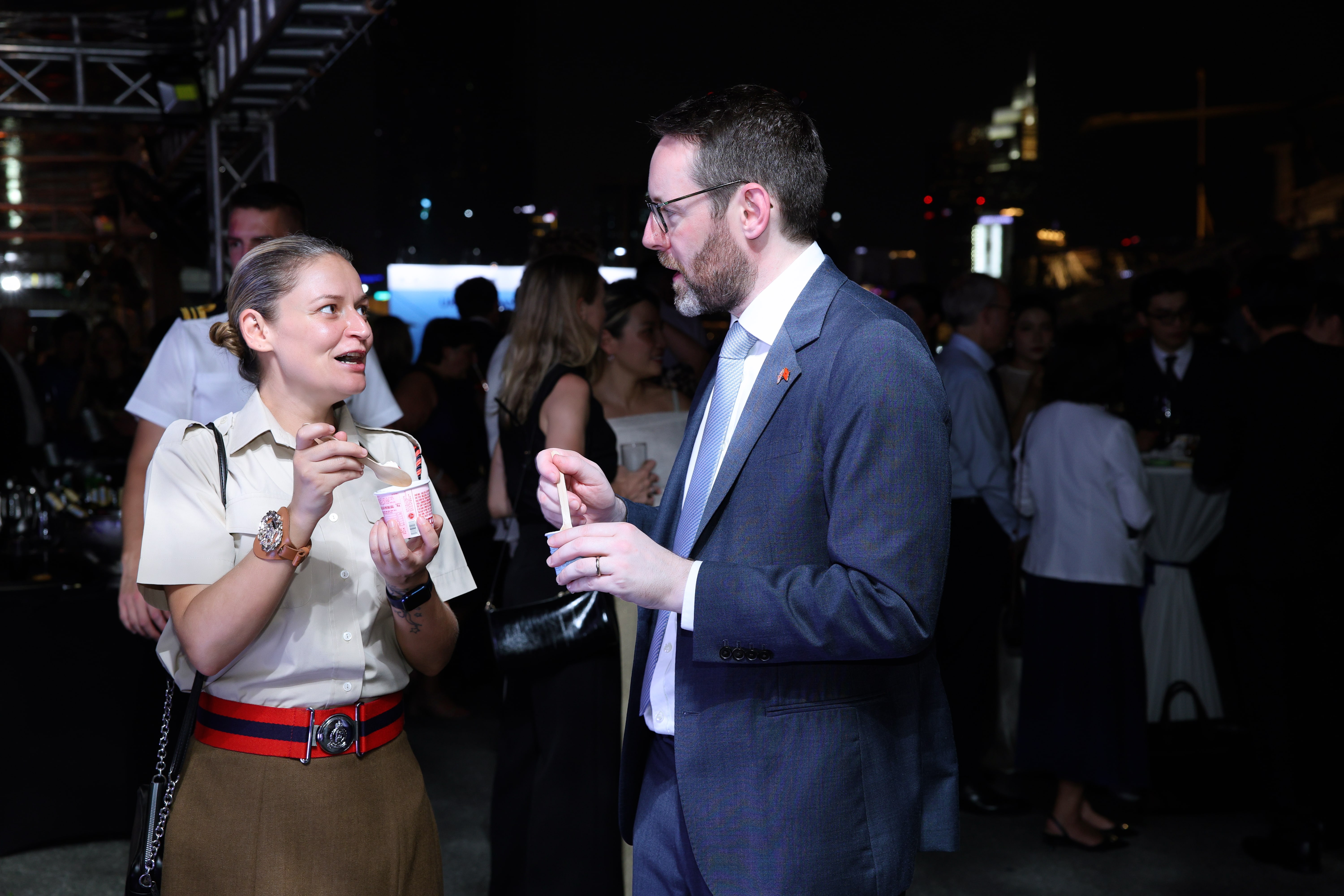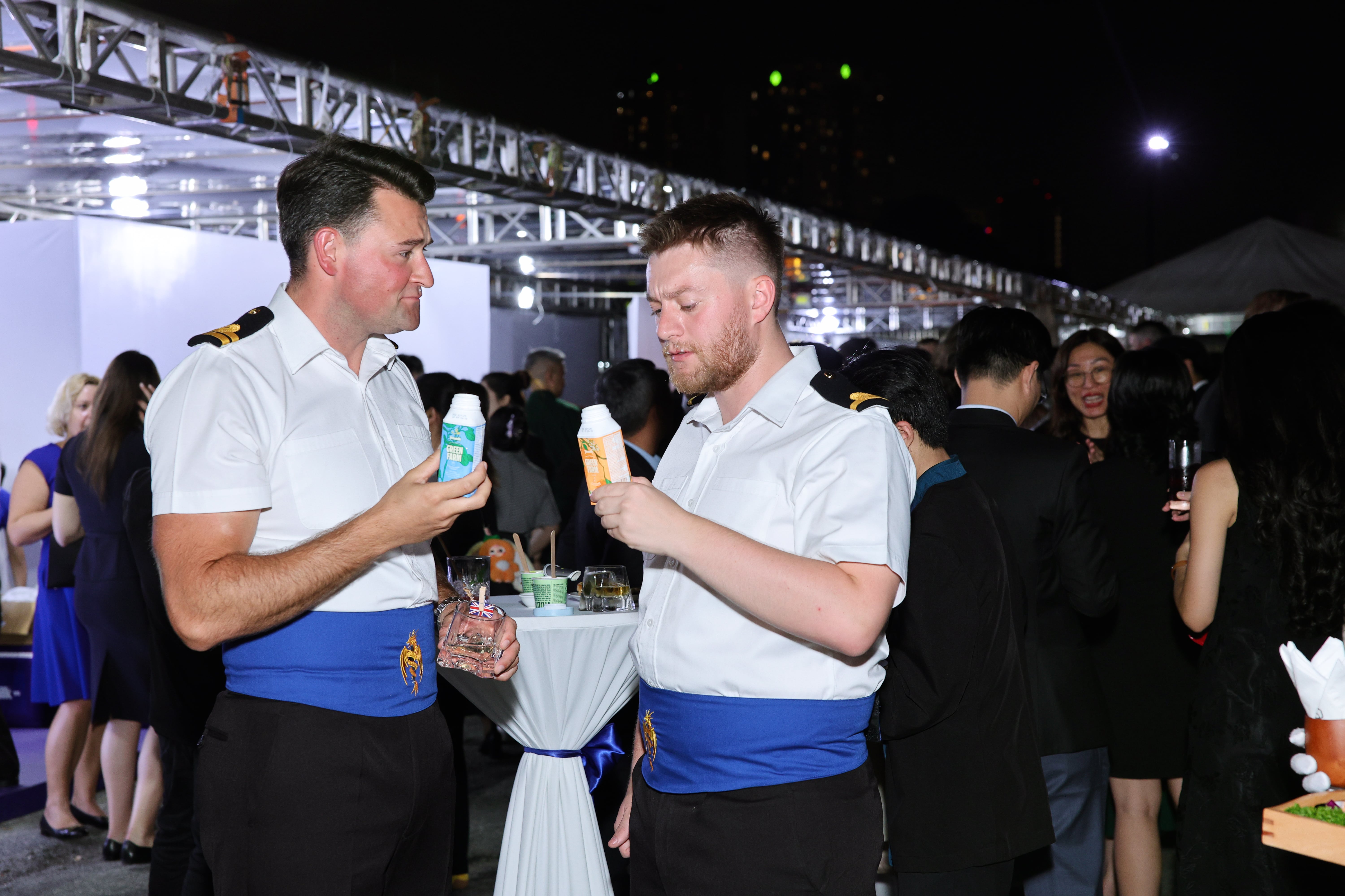Trong không gian sang trọng của sự kiện đón tàu Hải quân Hoàng gia Anh tại TP.HCM, nhiều khách quốc tế bày tỏ sự ấn tượng và thích thú khi lần đầu trải nghiệm những ly kem, sữa chua hay trà kombucha mát lành từ Vinamilk.