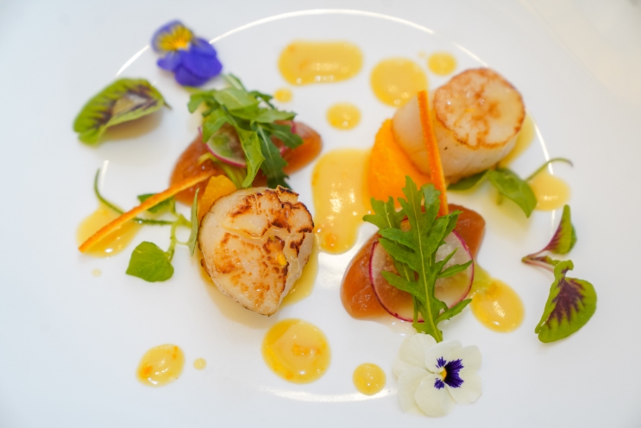 Món khai vị cho thực khách là Sò điệp Hokkaido áp chảo ăn kèm mứt táo và sa lát cam Mỹ.